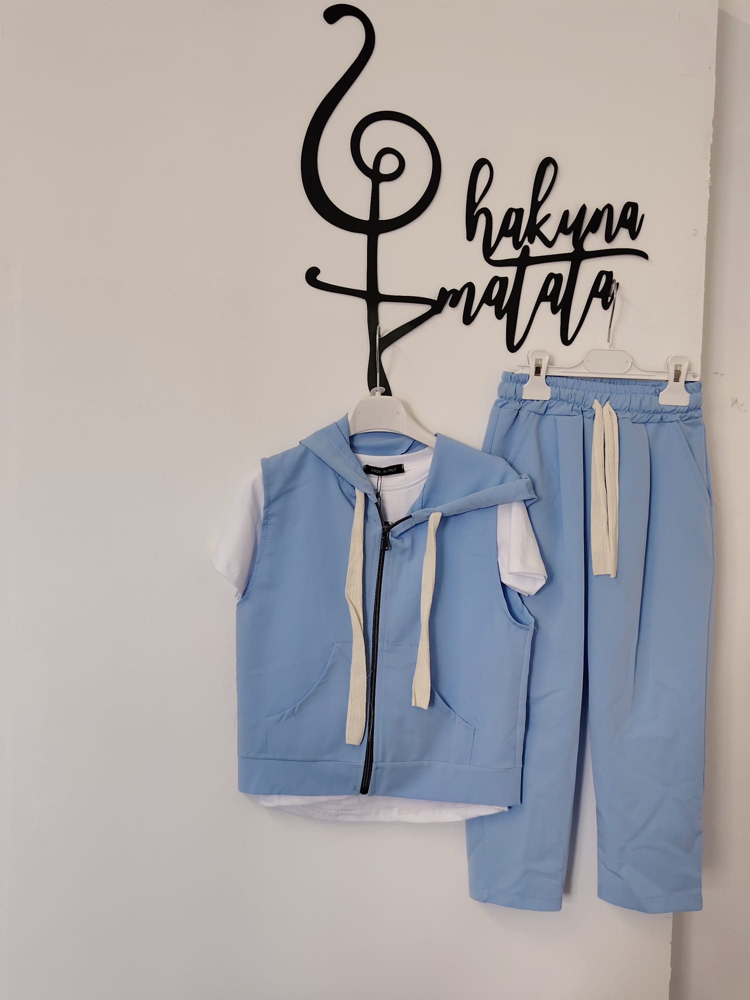 COMPLETO DA BAMBINO COMPOSTO DA PANTALONE, T-SHIRT BIANCA E GILET AZZURRO CON CAPPUCCIO
