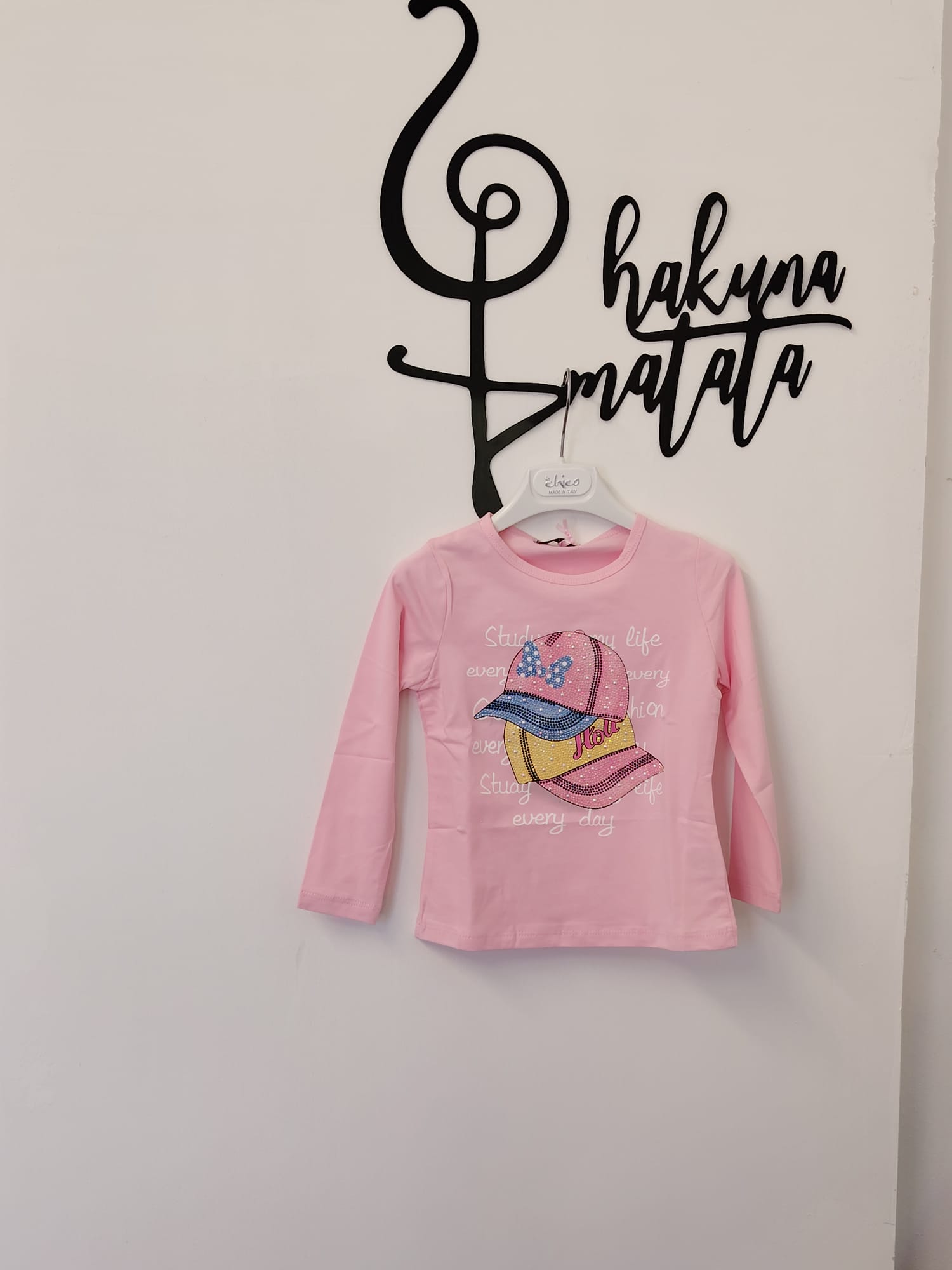 MAGLIETTA A MANICA LUNGA ROSA IN COTONE CON DECORAZIONE CAPPELLO BRILLANTINATO