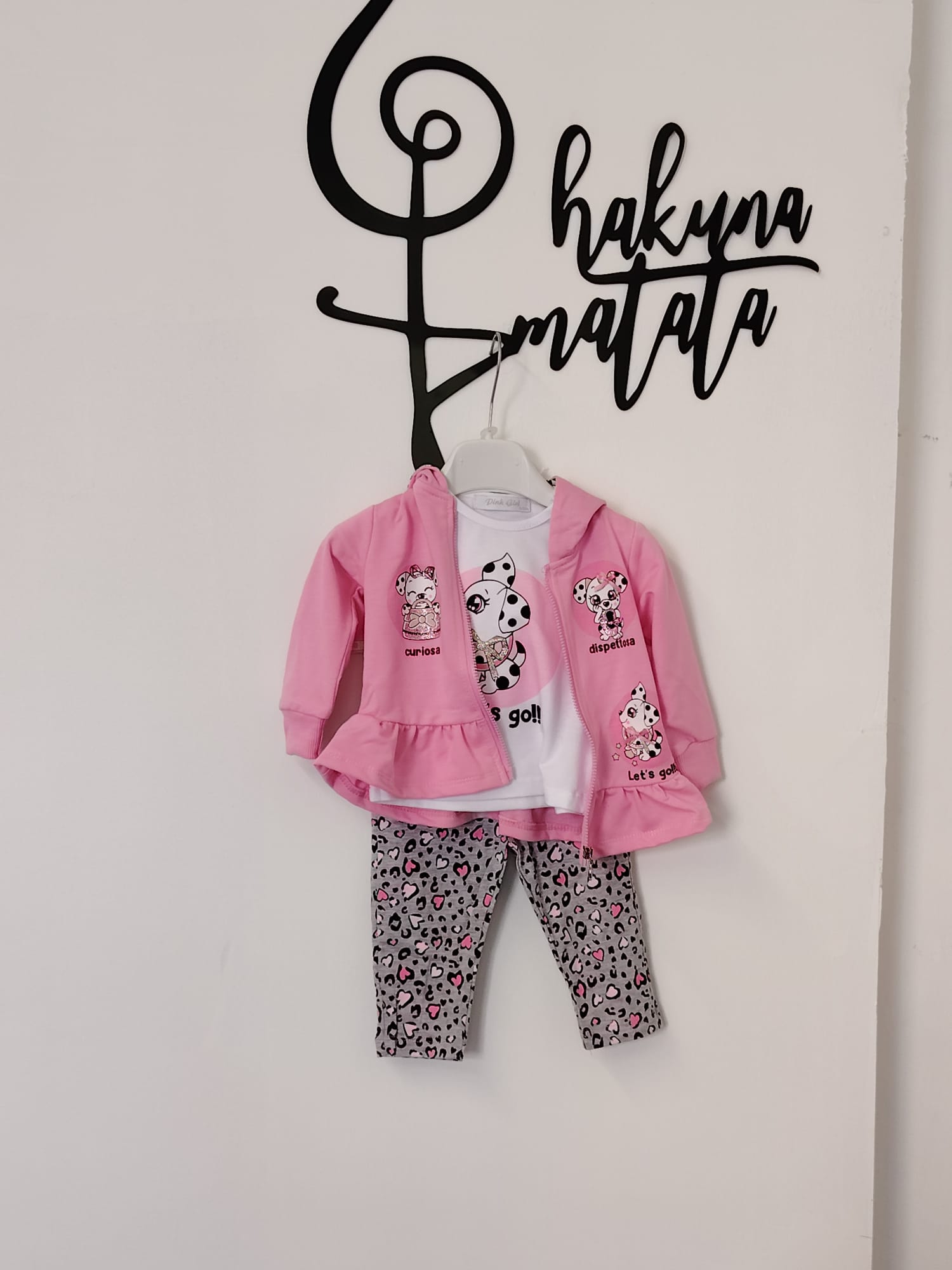 TUTA NEONATA COMPOSTA DA MAGLIA A MANICA CORTA, FELPA ROSA CON CAPPUCCIO E PANTALONE EFFETTO MACULATO